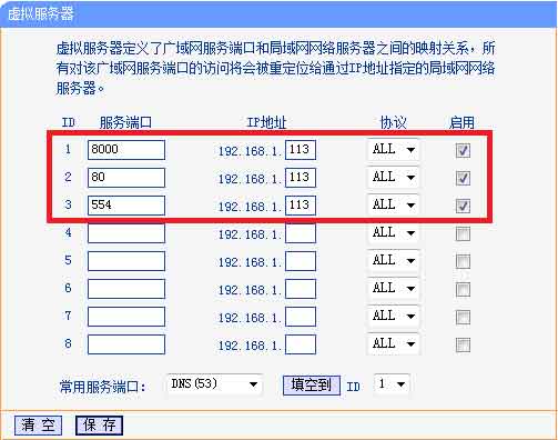 登陸路由器的配置界面,找到虛擬服務器(或者是端口映射),映射端口(設備默認80、8000、554三個端口,可在設備上修改,三個端口必須同時映射,缺一不可)
